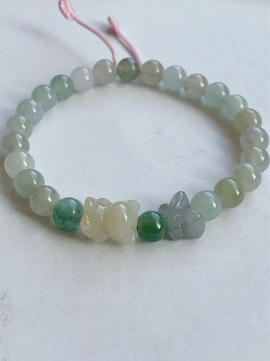 Natural Icy Translucent Gelatinous Multicolored Jadeite Beads Teddy Bear & Butterfly Beaded Bracelet 6.75” 天然冰胶多宝翡翠小熊和蝴蝶圆珠手串