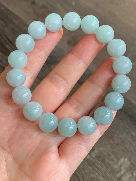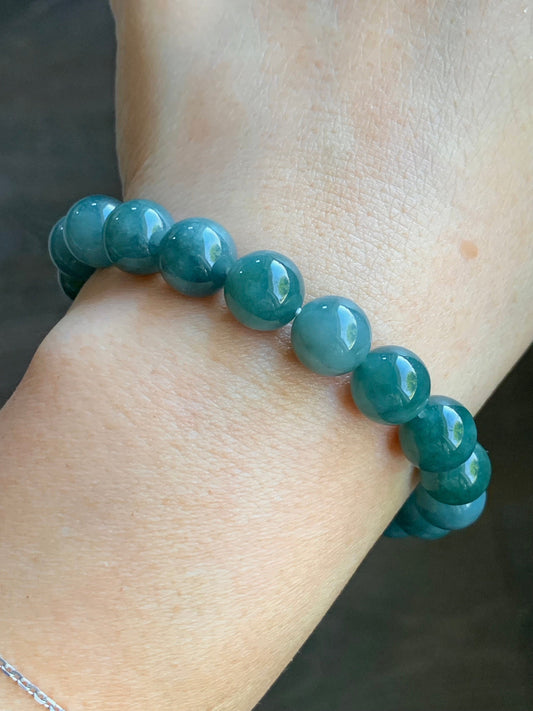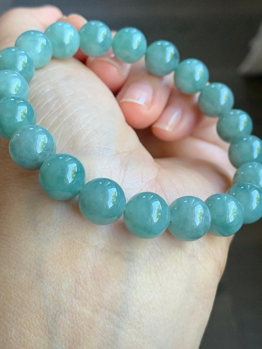 Natural Guatemalan Translucent Teal Blue Jadeite Beaded Bracelet Stretchy 9.5mm 7.25” 32g 天然冰危糯种蓝绿翡翠圆珠手串 WTB21