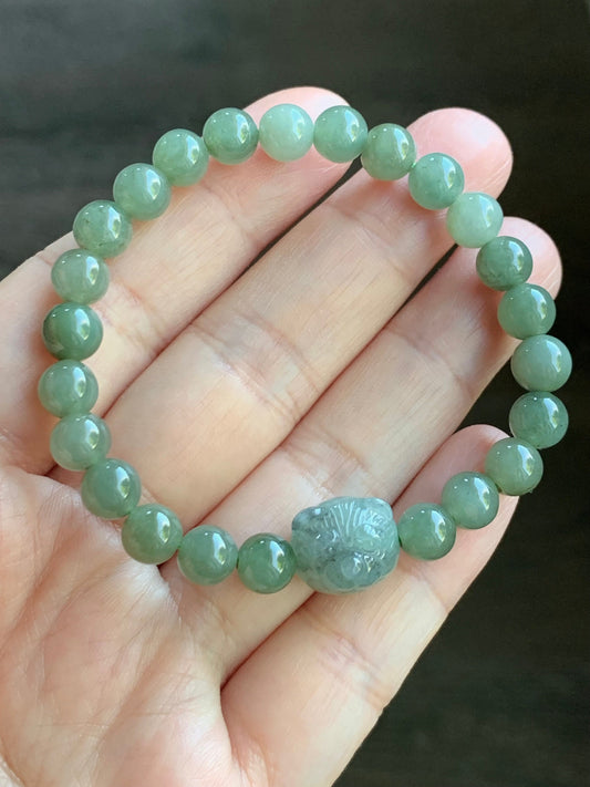 Natural Icy Translucent Gelatinous Olive Green Jadeite Beads Green Wuji Teddy Bear Beaded Bracelet 6.25” 天然冰胶油晴翡翠圆珠绿乌鸡小熊手串
