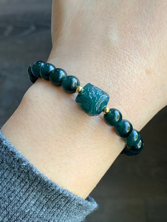 Natural Guatemalan Icy Translucent Gelatinous Dark Teal Green Jadeite Dancing Lion Bead Beaded Bracelet 7” Sterling Silver 天然冰胶危湖水绿翡翠醒狮珠手串