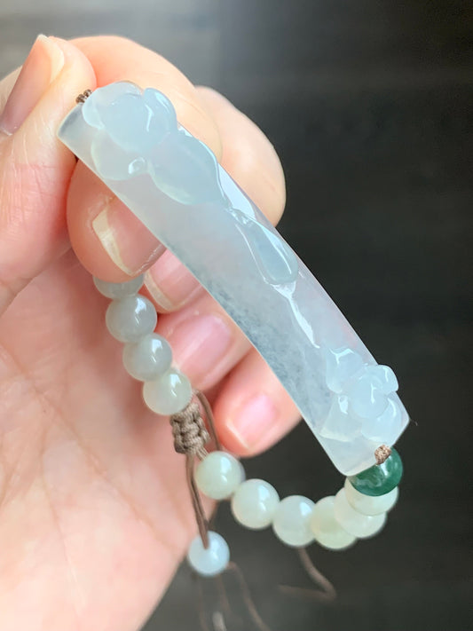 Natural Grade A Premium Icy Green Jadeite Openwork Engraving Icy White Bead Beaded Bracelet 7" 天然冰胶晴底翡翠起光白冰仿古镂空雕手牌手串