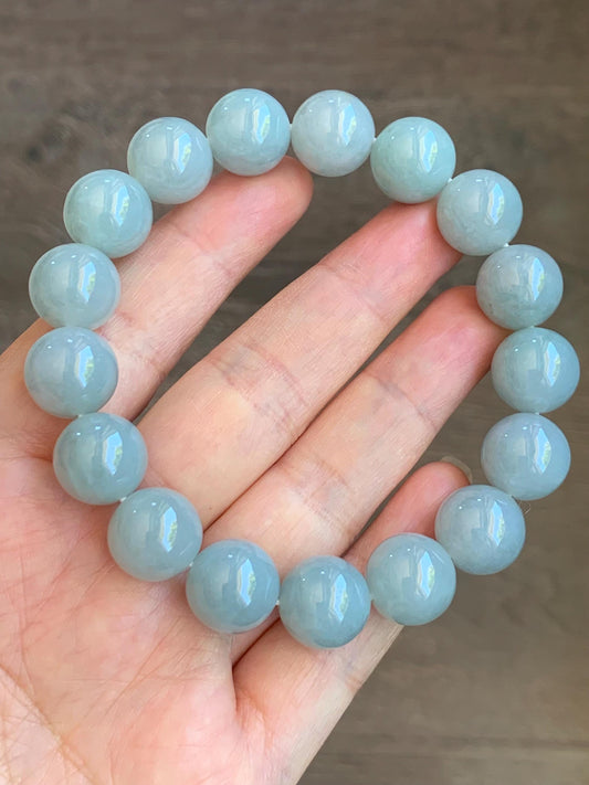 Large Natural Icy Translucent & Gelatinous Light Blue Sky Blue Jadeite Mala Beaded Bracelet 11.7mm 8” 天然糯冰胶天空蓝翡翠手串 TKL611