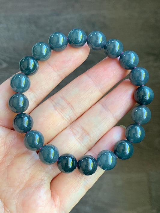 Natural Guatemalan Icy Translucent Gelatinous Dark Wuji Jadeite Round Beads Beaded Bracelet Stretchy 7.25” 9.8mm 32g 天然冰胶危乌鸡翡翠圆珠手串 WJ-A