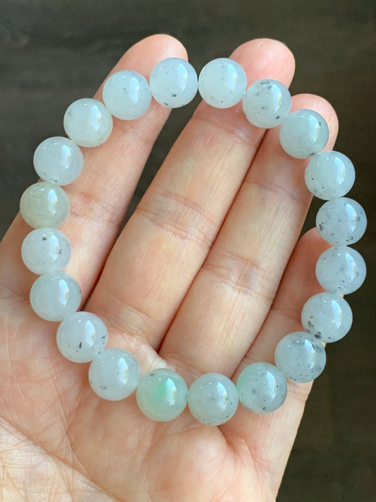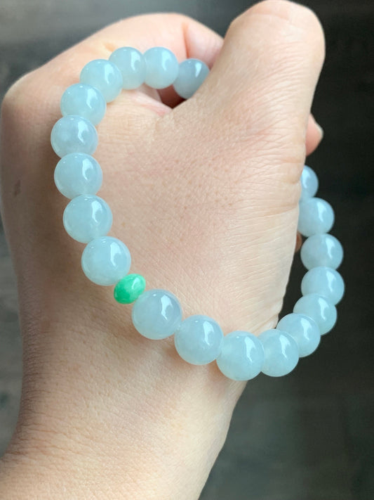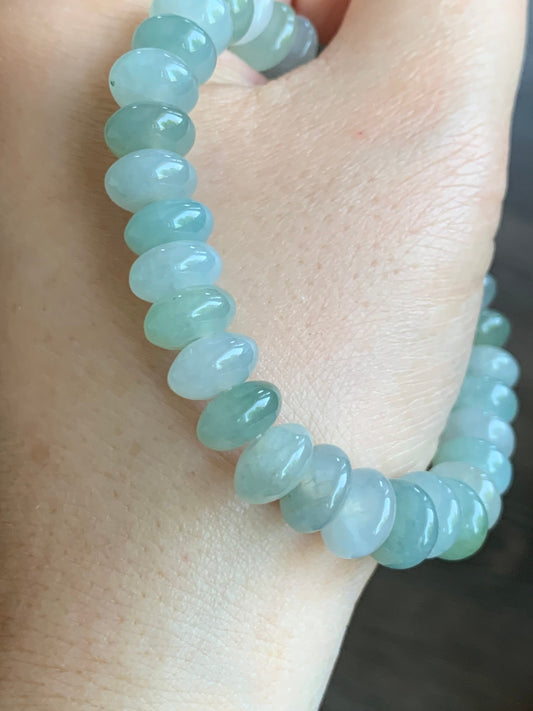 Natural Icy Translucent Gelatinous Pale Blue Jadeite Green Jadeite Drum Bead Beaded Bracelet Stretchy 9mm 7.25” 天然冰胶淡蓝翡翠手串 DDL83