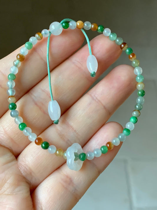 Natural Icy Translucent Multi-Colored Jadeite Petite Beads w/ Flower Sliding Jadeite Ring Beaded Bracelet 6.75” 天然冰多宝翡翠小圆珠白冰跑环手串