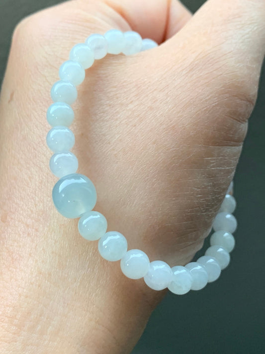 Natural Icy Translucent Gelatinous White Jadeite Beads Light Sky Blue Jadeite Apple Bead Beaded Bracelet 6.75” 天然细糯白冰翡翠珠晴色苹果珠手串