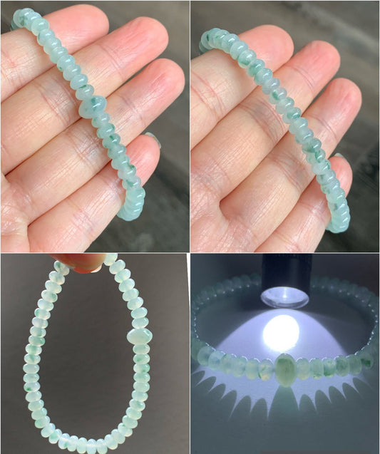 Natural Icy Highly Translucent Gelatinous Light Green Marbled Jadeite Mini Drum Beads Beaded Bracelet 6.5” 天然冰胶飘花翡翠迷你鼓珠手串 PHSP219