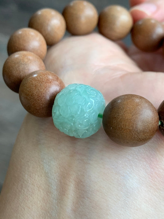 Natural Chandan Sandalwood Beads & Natural Translucent Icy Apple Green Jadeite Engraved Drum Bead Bracelet 7.75” 老山檀木珠天然冰果绿翡翠鼓珠手串