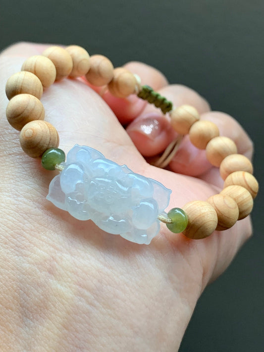 Natural Icy Translucent Gelatinous White Jadeite Lotus Flower YaBai Wood Beads Beaded Bracelet 6.5” 天然白冰胶翡翠莲花手牌崖柏木珠手串