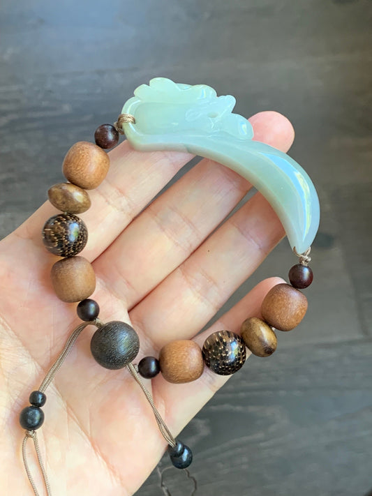 Natural Icy Translucent Dusty Sage Green Jadeite Carved 3D Dragon Hook Wood Beads Beaded Bracelet 7.25” 天然冰淡橄榄绿翡翠立体雕龙钩木珠手串