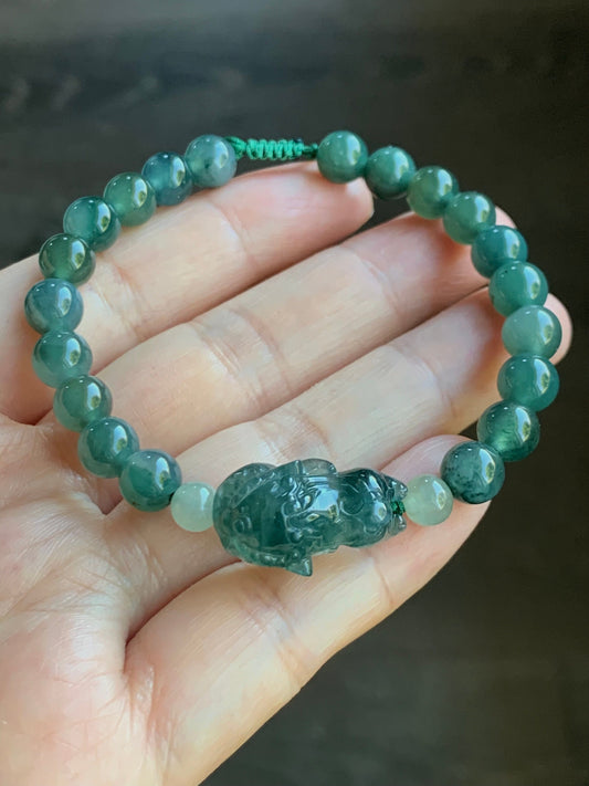 Natural Guatemalan Icy Highly Translucent Gelatinous Dark Teal Blue Jadeite Dancing Lion Beaded Bracelet 6.75” 16g 天然冰胶危湖水蓝翡翠精工雕摆烂小醒狮手串