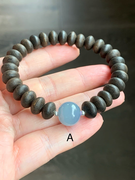 Natural Guatemalan Icy Translucent Gelatinous Dusty Blue Jadeite Apple Bead Agarwood Sterling Silver Beaded Bracelet 7” 天然冰胶危蓝翡翠苹果珠土沉香鼓珠手串