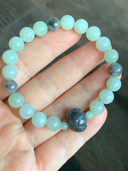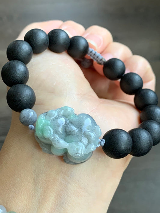 Large Natural Icy Wuji Jadeite with Green Marbling Carved Pixiu Black Agarwood Beaded Bracelet 7.75" 天然细糯乌鸡带绿翡翠貔貅土沉香木珠手串