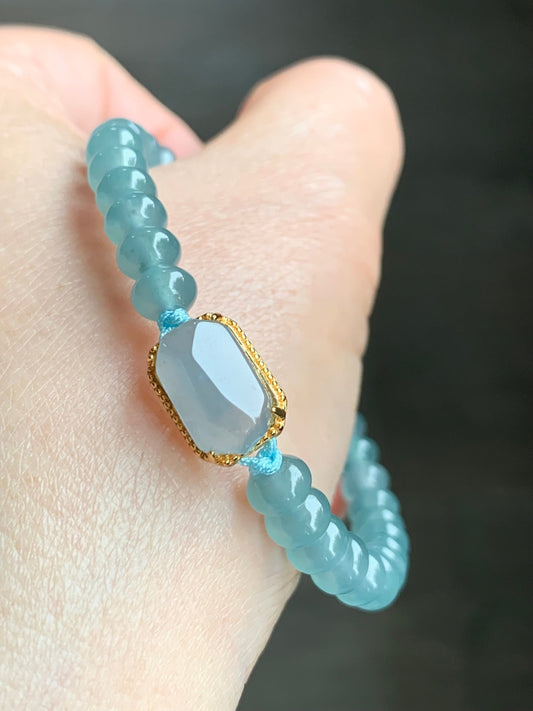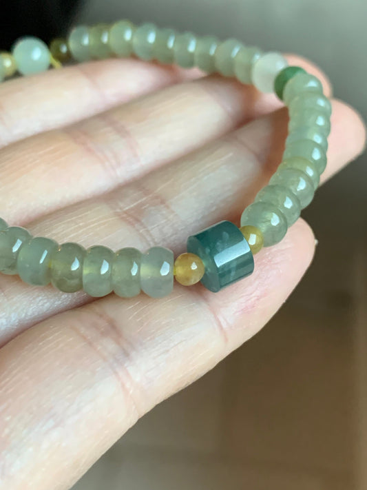 Natural Icy Beige & Guatemalan Blue Translucent Gelatinous Jadeite Flat Beads Beaded Bracelet 7” 13g 天然冰胶冰黄翡翠算盘珠冰危蓝桶珠手串