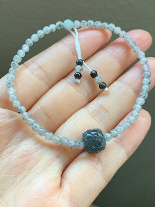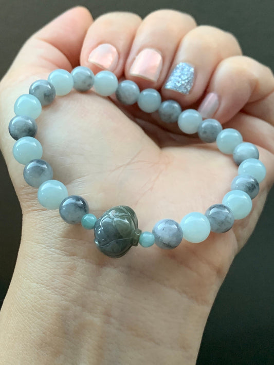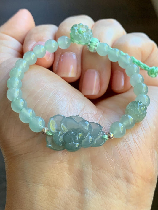 Certified Natural Icy Translucent Dusty Teal Blue & Light Green Jadeite Lotus Flower Beaded Bracelet 6.25”-7.25” 天然冰蓝翡翠莲花晴底珠手串 936