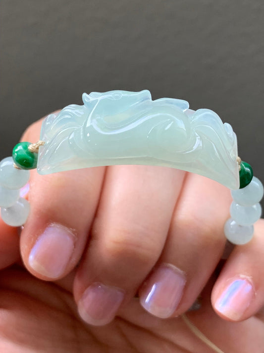 Stunning Natural Icy Translucent Gelatinous Light Green Jadeite Carved 9-Tailed Fox Beaded Bracelet 天然冰胶晴底翡翠九尾狐手牌手串