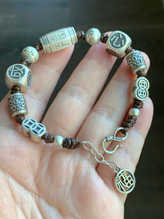 999 Sterling Silver Blessing Charms Bracelet Satin Finish Adjustable 7"-7.75" 12 grams 纯足银999心想事成招财进宝磨砂珠手串