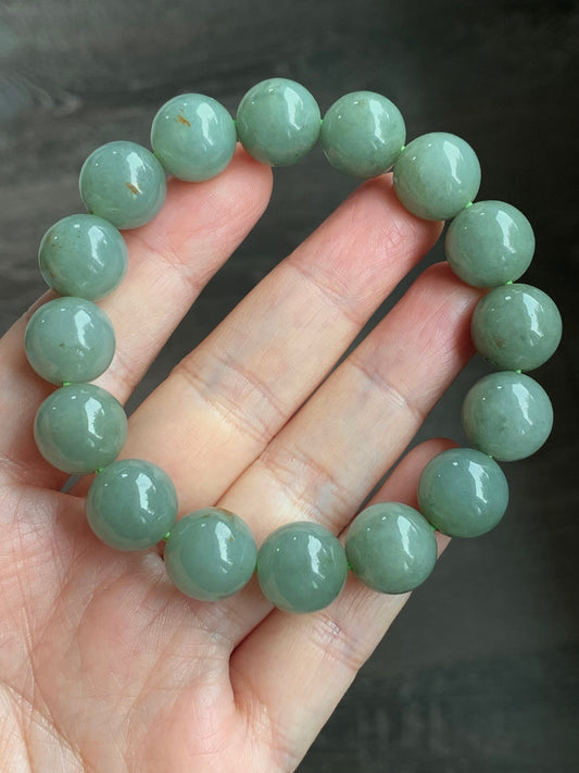 Large Natural Icy Translucent Dusty Sage Green Jadeite w/ Yellow Marbling Beaded Bracelet Stretchy 12.8mm 7.5” 58g 天然冰豆绿撒金翡翠大卡手串