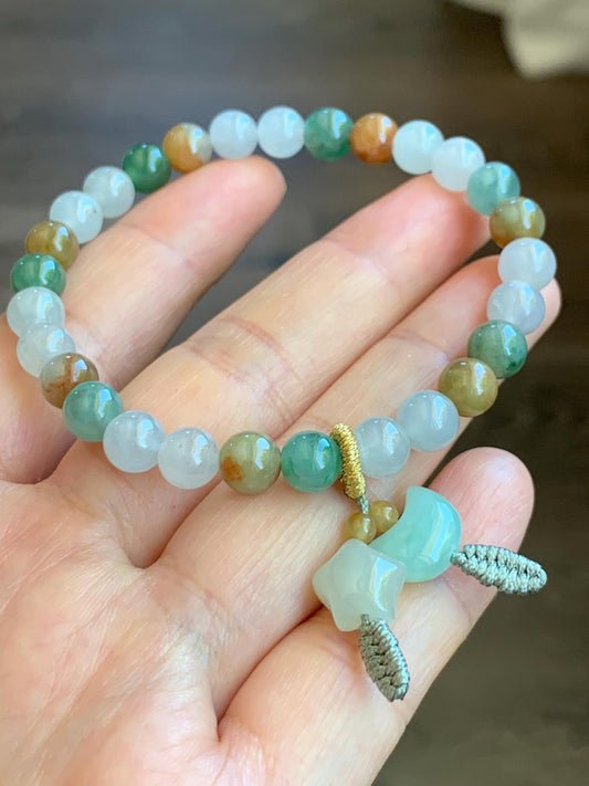 Natural Icy Translucent Multi-Colored Jadeite Petite Beads Beaded Bracelet Rabbit Charm Stretchy 6.7mm 7” 16g 天然冰多宝翡翠星星月亮手串