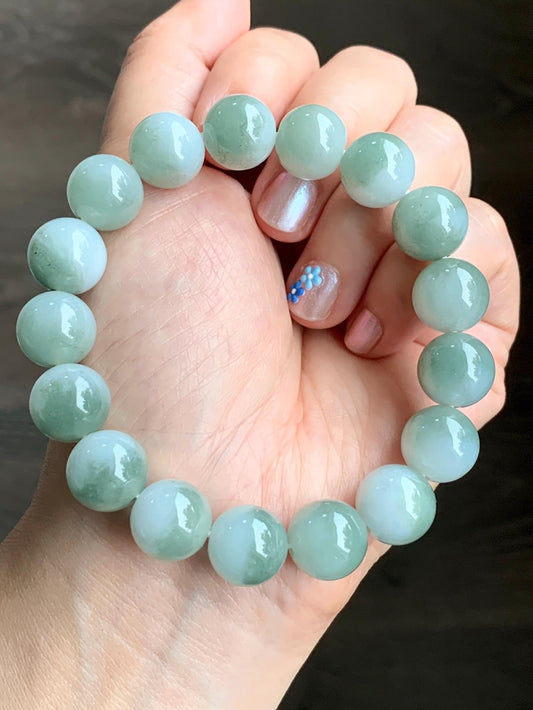 Large Natural Grade A Icy Translucent Bicolored Jadeite Round Beads Mala Beaded Bracelet Stretchy 12.8mm 8” 62g 天然冰白加淡橄榄绿鸳鸯翡翠手串 BSB300