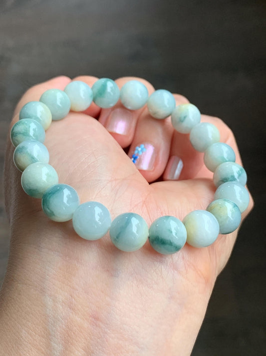 Natural Grade A Icy Translucent Teal Green & Yellow Marbled Tricolored Jade Jadeite Beaded Bracelet 10mm 7.25" 34g 天然糯冰三彩珠翡翠手串 SCZ220