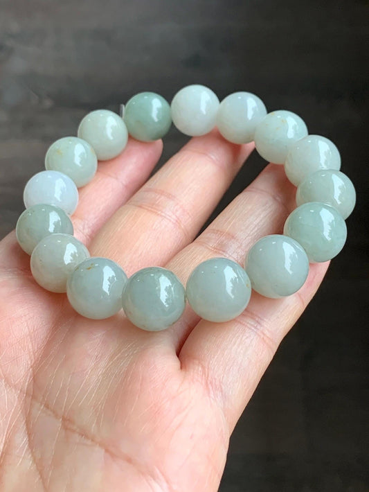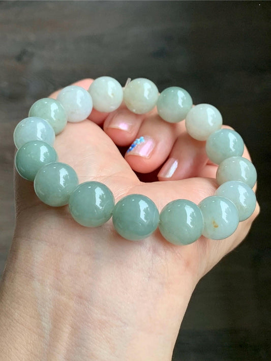 Natural Grade A Icy Translucent Pastel Dusty Green Multicolored Jadeite Large Beaded Bracelet Stretchy 12.88mm 7.5” 58g 天然细糯多宝翡翠大卡手串 AYS268