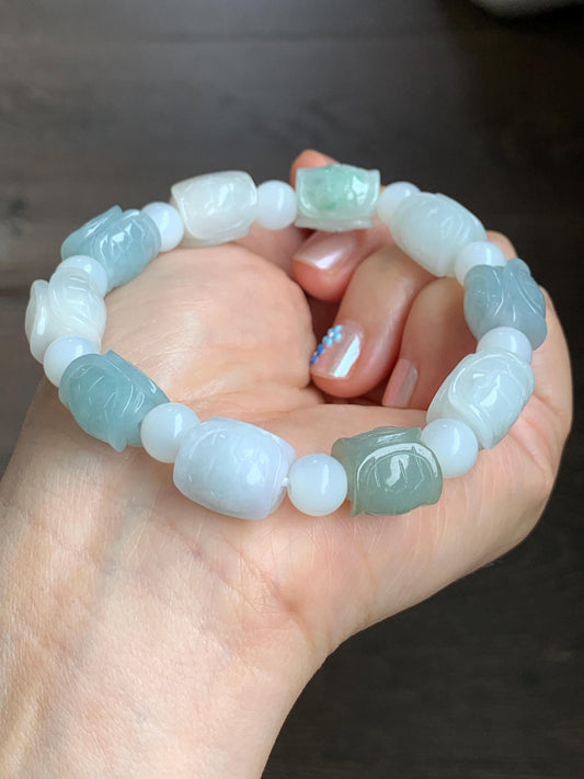 Natural Grade A Icy Translucent Gelatinous Dusty Green Jadeite Engraved Barrel Beads Agates Beaded Bracelet 7" or 7.5” 天然冰胶淡绿翡翠仿古桶珠手串 FGZ368