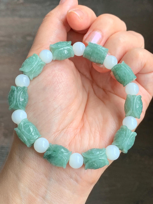 Natural Grade A Translucent Dusty Green Jade Jadeite Carved Turtle Shell Charm Beaded Bracelet 7.75” 36g Stretchy 天然糯种豆绿翡翠富甲玛瑙手串 FJL336