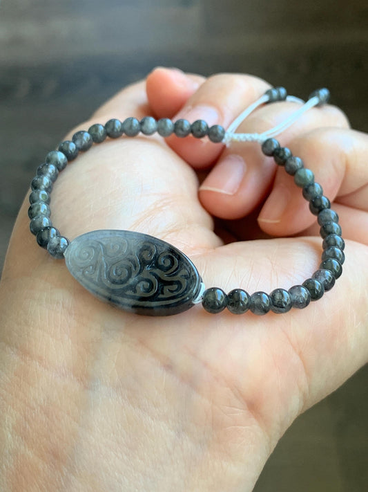 Natural Grade A Icy Highly Translucent Gelatinous Wuji Jade Jadeite Engraved Oval Coin Petite Beaded Bracelet 6.75 8g 天然冰胶乌鸡翡翠手牌圆珠手串 WJP165