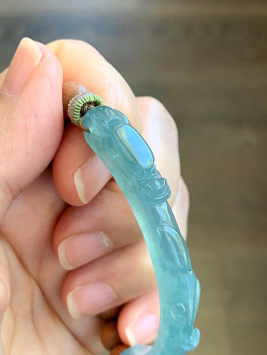 Natural Grade A Guatemalan Icy Highly Translucent Bright Blue Jadeite Dragon Hook Cuff Wood Beads Beaded Bracelet 6.75" 天然高冰危龙钩手牌木珠手串 GWL250