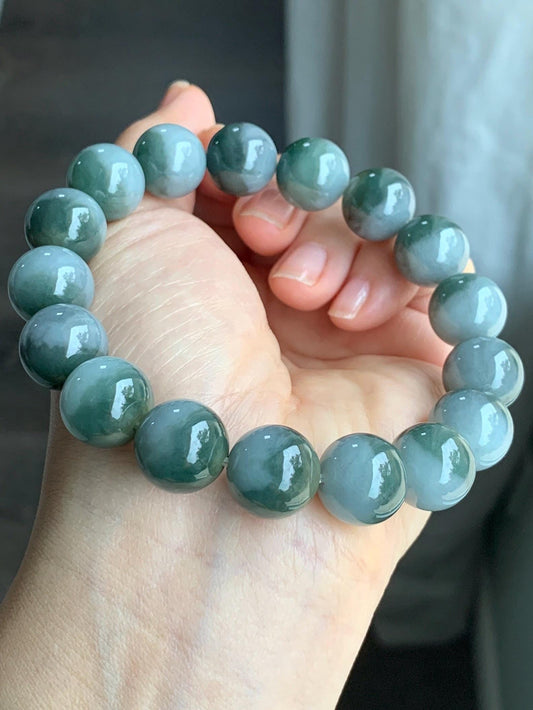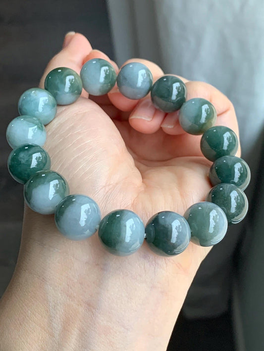 Large Natural Grade A Icy Translucent Bi-Colored Jade Jadeite Mala Beaded Bracelet Stretchy 14mm 8.5” 81g 天然灰蓝深绿鸳鸯双色翡翠大卡手串 YYD416