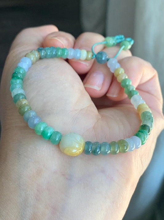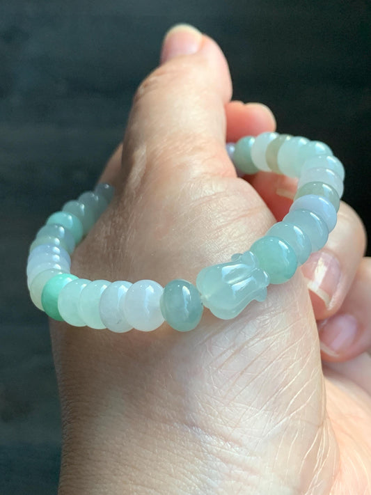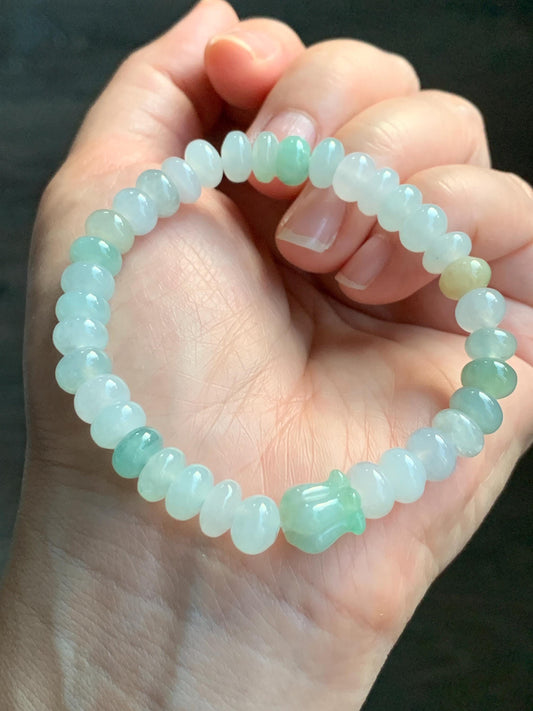 Natural Grade A Icy Translucent Multicolored Jadeite Flat Beads Carved Bunny Rabbit Charm Beaded Bracelet 7.25" 天然冰多宝翡翠算盘珠黄翡面包兔手串 DBSP297