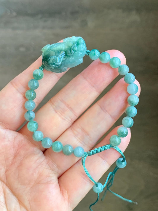 Natural Grade A Icy Translucent Gelatinous Dark Teal Green Marbled Jade Jadeite Pixiu Beaded Bracelet 6.5" 17g 天然冰飘花翡翠貔貅圆珠手串 MPP-S