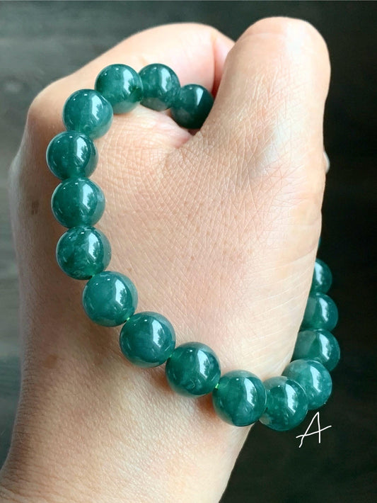 Natural Guatemalan Grade A Icy Translucent Dark Teal Green Jade Jadeite Beaded Bracelet Stretchy 9.8mm 7.25” 33g 天然冰危糯种深蓝绿翡翠圆珠手串 WSL290