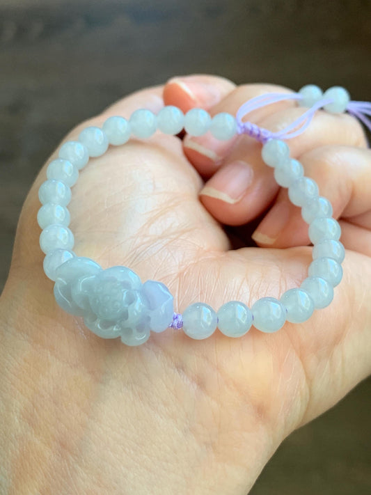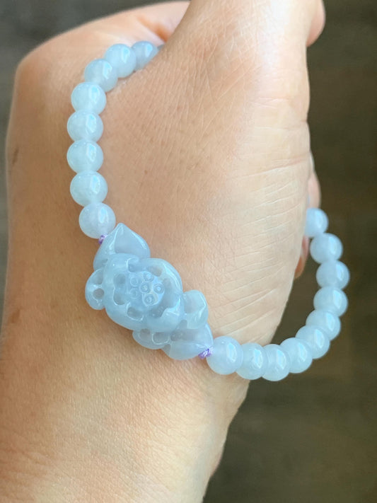Natural Grade A Icy Translucent Gelatinous Pastel Purplish Blue Jade Jadeite Lotus Flower Beaded Bracelet 6.5" 11g 天然冰淡蓝紫底翡翠莲花圆珠手串 DLZ-B