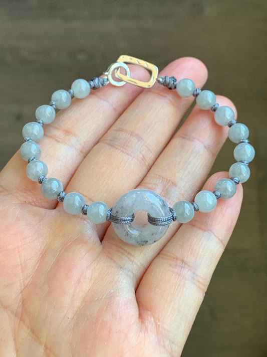 Natural Grade A Icy Translucent Gelatinous Wuji Jadeite Ping An Kou Donut Beaded Bracelet Sterling Silver 7” 6mm 10g 天然冰乌鸡翡翠平安扣珠串手串 WJK129