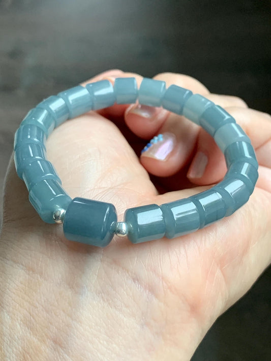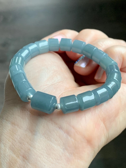 Natural Grade A Guatemalan Icy Translucent Gelatinous Dusty Blue Jadeite Barrel Beads Beaded Bracelet Stretchy 6.5” 25g 天然冰危篮翡翠桶珠手串 WLG213B