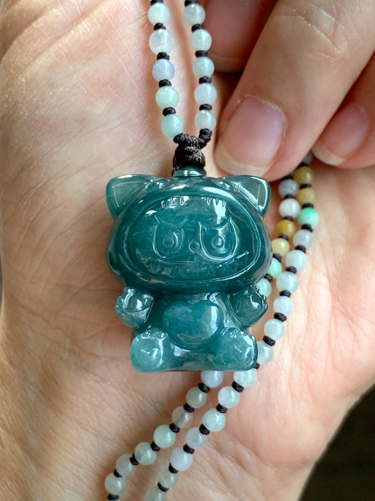 Natural Grade A Guatemalan Icy Translucent Dark Teal Blue Jade Jadeite Carved Labubu Pendant Beaded Necklace 23.5” 天然冰危深蓝绿翡翠吊坠 LBB138