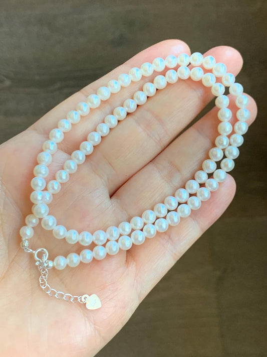 Natural Freshwater All-Nacre Metallica White Mini Round Pearls Beaded Necklace Sterling Silver 4-4.7mm 15.75”-16.5” 10g 天然淡水无核白珍珠项链 MWHZ560B