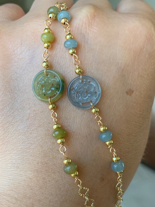 Natural Guatemalan Icy Highly Translucent Jadeite Carved Qilin Tag Bracelet 14K Gold Plated adjustable up to 7.5” 天然冰危高冰翡翠麒麟牌14K包金手链