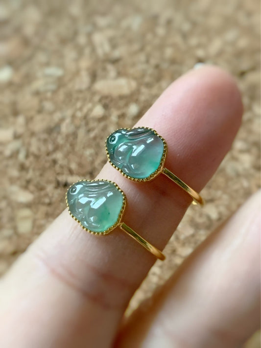 Certified Natural Guatemalan Icy Highly Translucent Gelatinous Light Green Marbled Jadeite Rabbit Ring 18K Yellow Gold Sz 7 天然冰危晴底飘花翡翠小兔镶嵌戒指