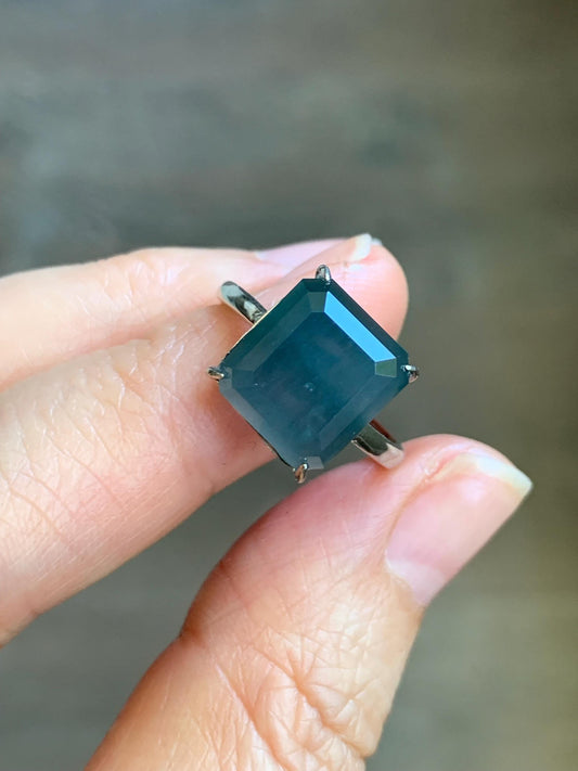 Large Natural Guatemalan Icy Translucent Dark Dusty Blue Jadeite Faceted Emerald Cut Ring Sterling Silver Adjustable 天然冰危深蓝切割面翡翠银镶戒指 WQG80B