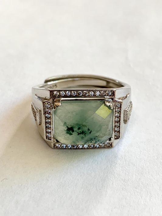 Natural Icy Translucent Gelatinous Faceted Dusty Green Faceted Jadeite Ring Sterling Silver Size 9 Adjustable 天然晴底飘花翡翠切割面银镶戒指 MQG