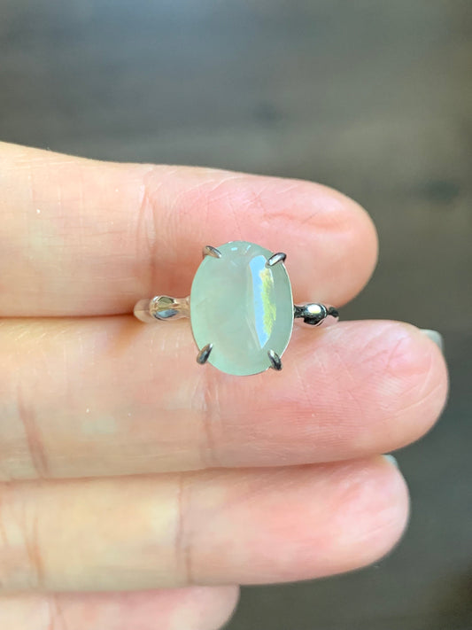 Natural Icy Light Green Translucent Oval Cabochon Jadeite Ring Bamboo Band Sterling Silver Size 6 Adjustable 天然冰晴底翡翠银镶竹节戒指 MZJ100