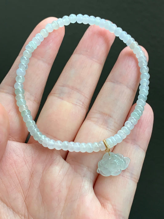Certified Natural Premium Icy Jadeite Petite Flat Beads Bracelet Light Green Jadeite Lotus Flower Charm 18K 7.25” 天然冰胶翡翠算盘珠手串莲花随意扣