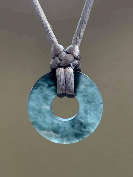 Natural Guatemalan Icy Translucent Gelatinous Wuji Jadeite Flat Ping An Kou Donut Pendant Rope Necklace Adjustable 26” 天然冰危胶乌鸡翡翠平扣吊坠