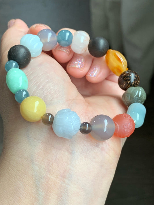 Natural Guatemalan Grade A Jadeite Agarwood Multi Gemstone Beads Beaded Bracelet Stretchy 7.5” 33g Sterling Silver 天然翡翠彩宝木珠银珠多宝手串