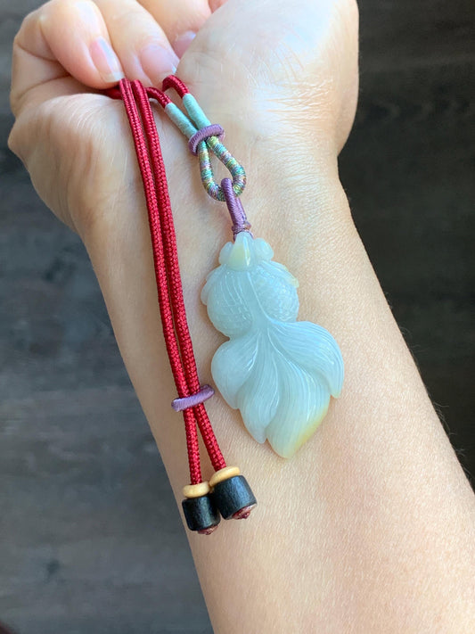 Natural Icy Translucent Light Green Jadeite w/ Yellow Marbling Carved Goldfish Pendant Rope Necklace 天然淡晴翡翠飘黄翡金鱼吊坠