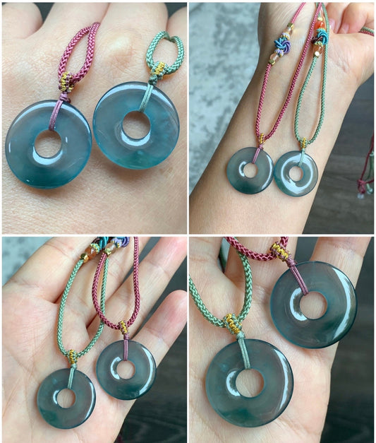 Natural Guatemalan Icy Highly Translucent Teal Blue Jadeite Ping An Kou Donut Pendant Rope Necklace 24” 天然冰危老蓝水翡翠平安扣吊坠