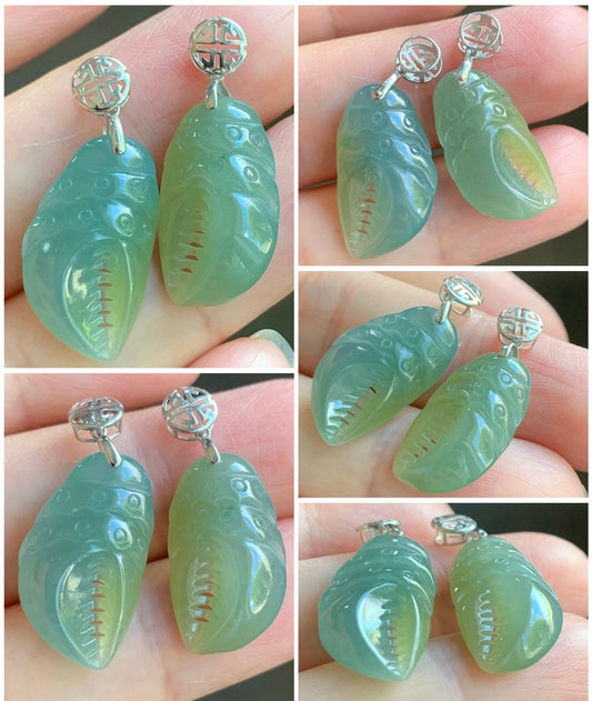 Natural Guatemalan Icy Translucent Dusty Blue & Yellow Jadeite Crab Claw Pendant 18K White Gold Bail 天然冰危蓝加黄翡翠蟹钳镶嵌吊坠